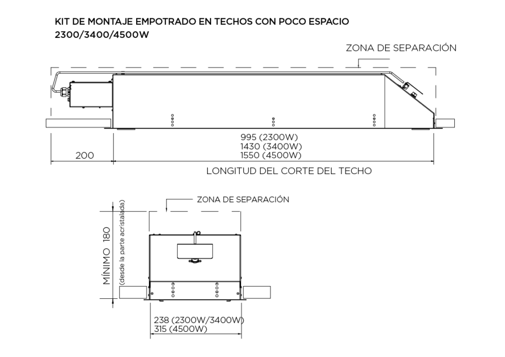El kit de empotramiento para espacios reducidos está equipado con un ventilador de enfriamiento integrado que requiere una fuente de alimentación dedicada, independiente de la conexión eléctrica del calentador. Para las especificaciones de cableado y los requisitos de instalación, consulte el manual de instalación.